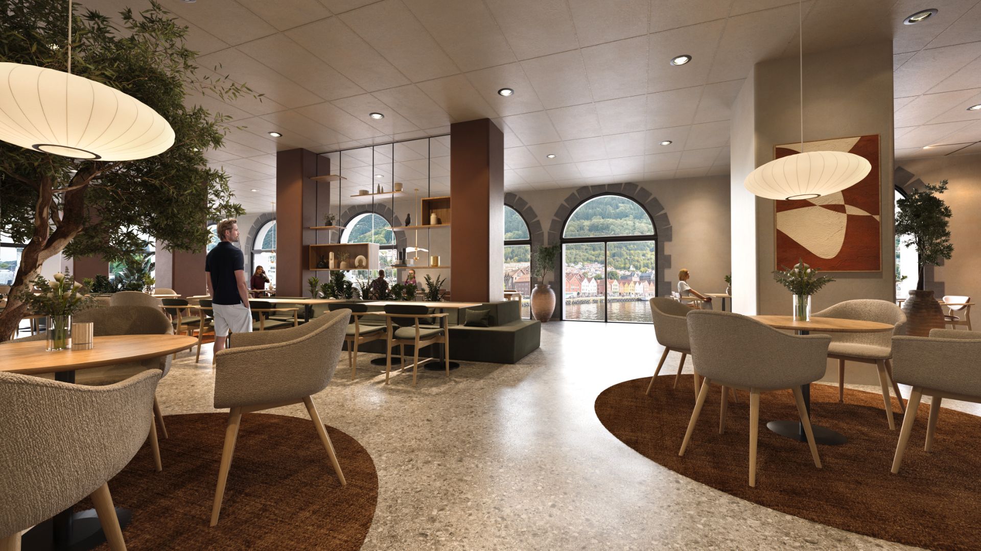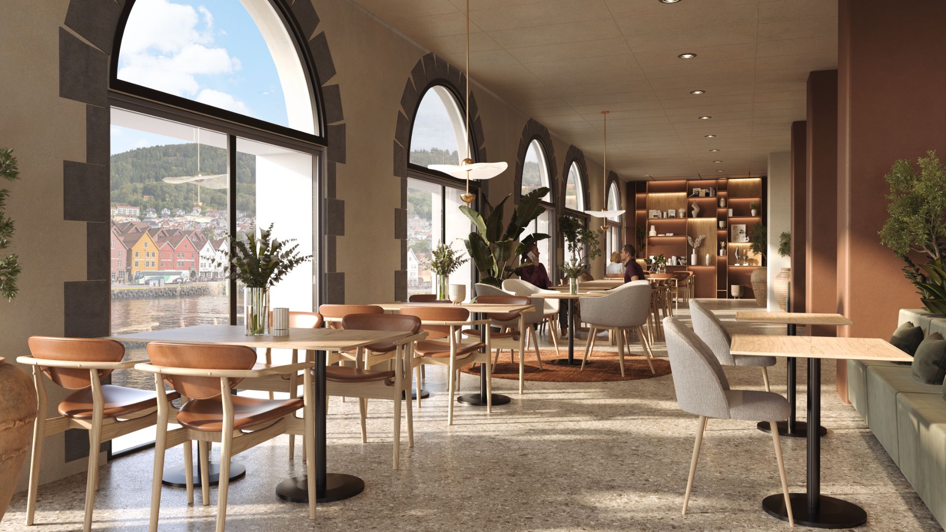 Mellom byggene er det i dag et åpent gårdsrom, dette gårdsrommet skal oppgraderes og integreres med eiendommens personalrestaurant og møteromssenter. Her får du ikke bare rykende fersk lunsj, du kan også nyte den til den nydelige utsikten over Vågen, Bryggen og byfjellene. Personalrestauranten blir et naturlig samlingspunkt for alle som holder til i Dampskibsgaarden og egner seg også godt til sosiale samlinger og arrangementer.